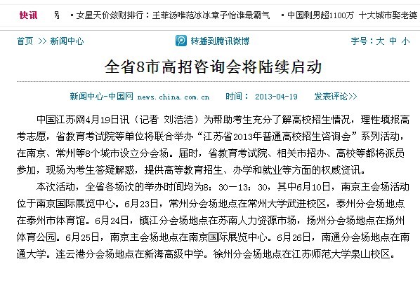 中国江苏网4月19日讯(记者 刘浩浩)为帮助考生充分了解高校招生情况,理性填报高考志愿,省教育考试院等单位将联合举办“江苏省2013年普通高校招生咨询会”系列活动,在南京、常州等8个城市设立分会场。届时,省教育考试院、相关市招办、高校等都将派员参加,现场为考生答疑解惑,提供高等教育招生、办学和就业等方面的权威资讯。