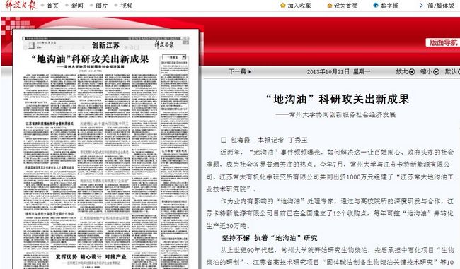 10月21日,《科技日报》在6版“创新江苏”头条从“江苏常大地沟油工业技术研究院”地沟油研究出新成果切入,以《“地沟油”科研攻关出新成果——常州大学协同创新服务社会经济发展》为题报道我校践行党的群众路线,坚持服务百姓、服务地方、服务社会,协同创新出新成果。内容具体如下: