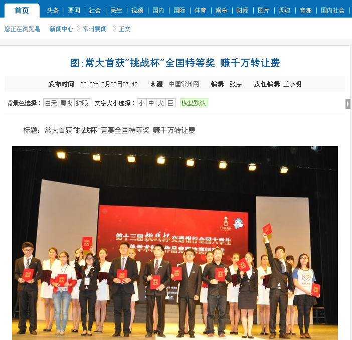 常州大学在此届“挑战杯”国赛中,无论获奖数量,还是级别,都取得历史性突破。并实现了常州高校在此项赛事中特等奖零的突破。