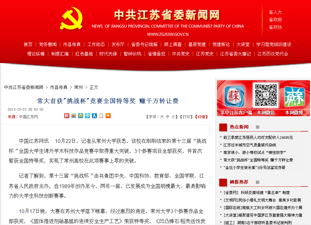 常州大学在此届“挑战杯”国赛中,无论获奖数量,还是级别,都取得历史性突破。并实现了常州高校在此项赛事中特等奖零的突破。