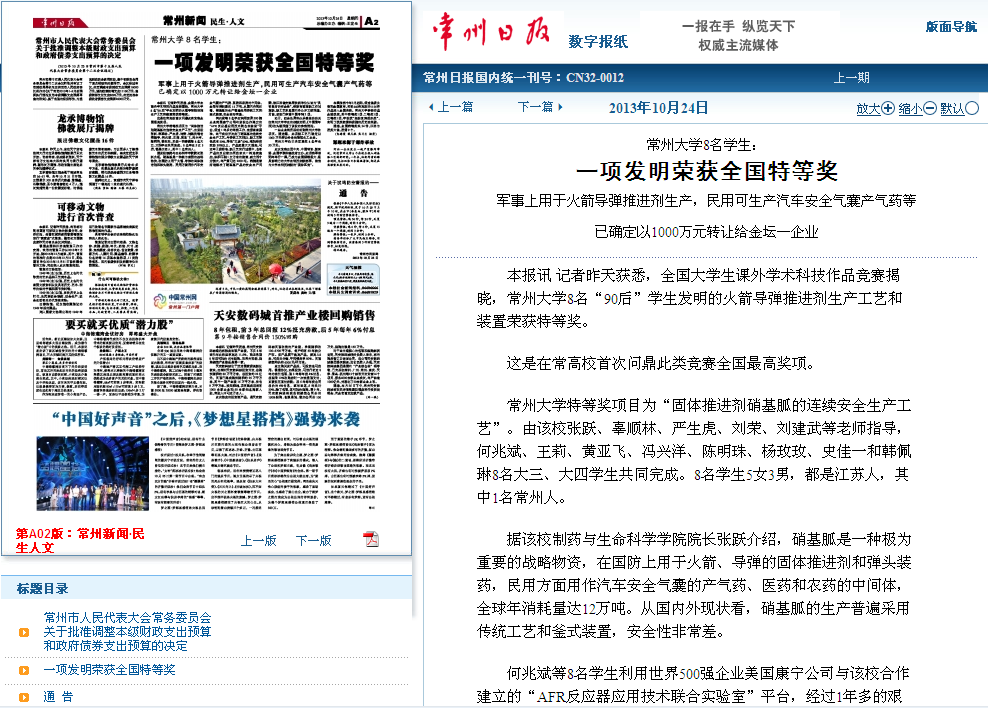 常州大学特等奖项目为“固体推进剂硝基胍的连续安全生产工艺”。由该校张跃、辜顺林、严生虎、刘荣、刘建武等老师指导,何兆斌、王莉、黄亚飞、冯兴洋、陈明珠、杨玫玫、史佳一和韩佩琳8名大三、大四学生共同完成。8名学生5女3男,都是江苏人,其中1名常州人。