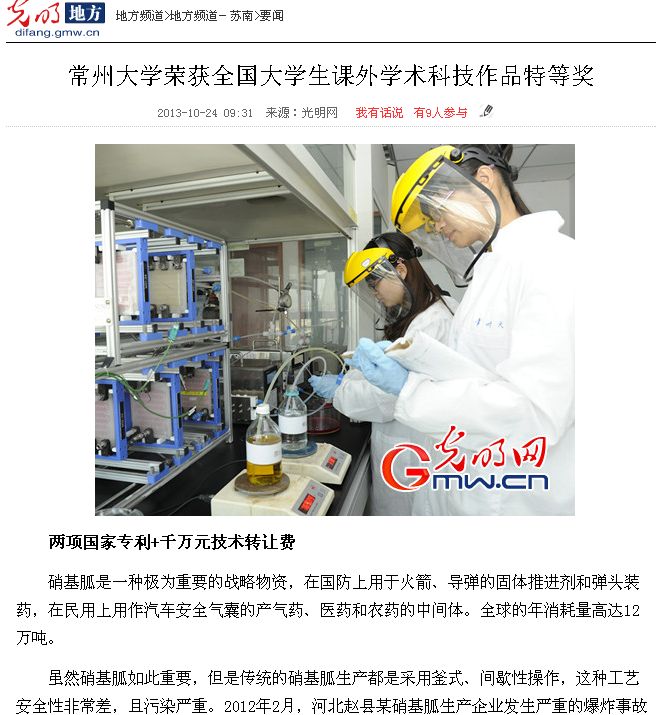 消息在震惊全国的同时,也触动了常州大学制药与生命科学学院的学生们。“当时我们就想硝基胍要是能用一种连续的方式生产出来就好了,那将对我们国家的硝化反应具有重大的示范意义。”王莉是该学院制药专业的一名大三学生,她告诉记者,想到了就干,几个兴趣相投的同学在老师的指导下,从前期调研开始,努力了一年多时间。期间,他们有成功、有挫败,在不断尝试后,他们发明了更适合生产硝基胍的微通道反应器,并设计了相应的工艺路线,用硫酸胍的硫酸溶液取代了容易引起爆炸的硝酸胍作为生产原料,成功实现了硝基胍的连续安全、清洁生产,废酸产生量降低了80%。