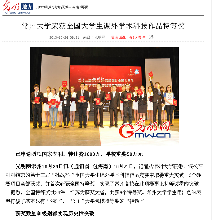 光明网常州10月24日讯(通讯员 包海霞)10月22日,记者从常州大学获悉,该校在刚刚结束的第十三届“挑战杯”全国大学生课外学术科技作品竞赛中取得重大突破,3个参赛项目全部获奖,并首次斩获全国特等奖,实现了常州高校在此项赛事上特等奖零的突破。据悉,全国特等奖共34件,江苏为获奖大省,共获9个特等奖。常州大学学生用出色的表现打破了基本只有“985”、“211”大学包揽特等奖的“神话”。