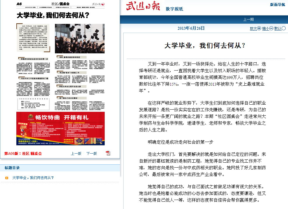 在这样严峻的就业形势下,大学生们到底如何选择自己的职业发展道路?是找一份实实在在的工作先赚钱,还是考研,为自己的未来开拓一条更广阔的就业之路?本期“社区圆桌会”走进常州大学制药与生命科学学院,邀请学生、老师和专家,畅谈大学毕业之后的人生之路。