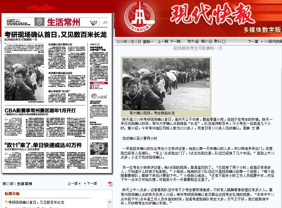 昨天是2014年考研现场确认首日,虽然天公不作美,飘起零星小雨,但挡不住考生的热情。昨天一早还没到确认时间,常州大学确认点就排起“长龙”,队伍延伸数百米,不少考生一站就是几个小时。据介绍,今年常州地区网报人数为6200多人,而首日有1300多人完成确认。晁静 文/摄