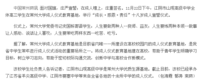 该校学生处负责人告诉记者,江阴市山观高级中学是常州大学优质生源基地。截止目前,该校已经承办了江苏省羊尖高级中学、江阴市要塞中学等来自全省各地的十余所中学的成人仪式。(包海霞 郁涛 束网)