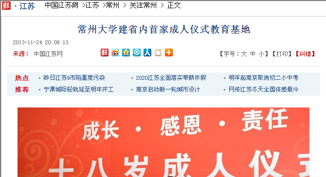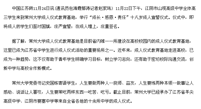 常州大学党委书记史国栋寄语学生:人生要做两种人--良师、益友,人生要练两种本领--做事让人感动、说话让人喜欢,人生要常吃两样东西--吃苦、吃亏。截止目前,常州大学已经承办了江苏省羊尖高级中学、江阴市要塞中学等来自全省各地的十余所中学的成人仪式。
