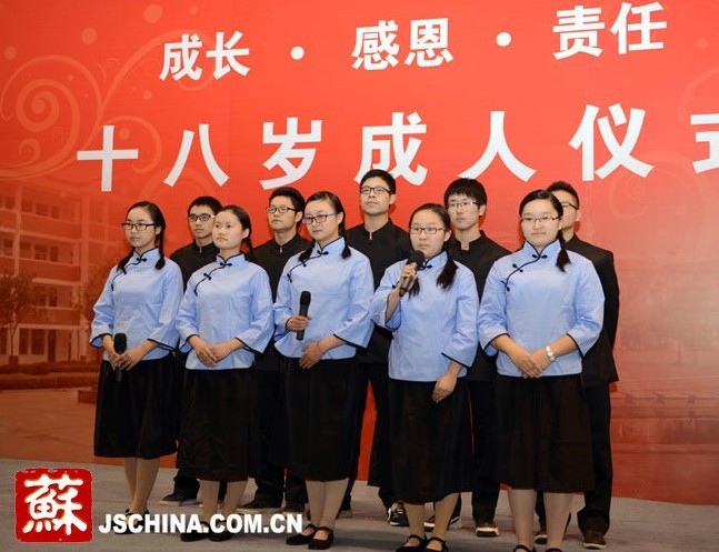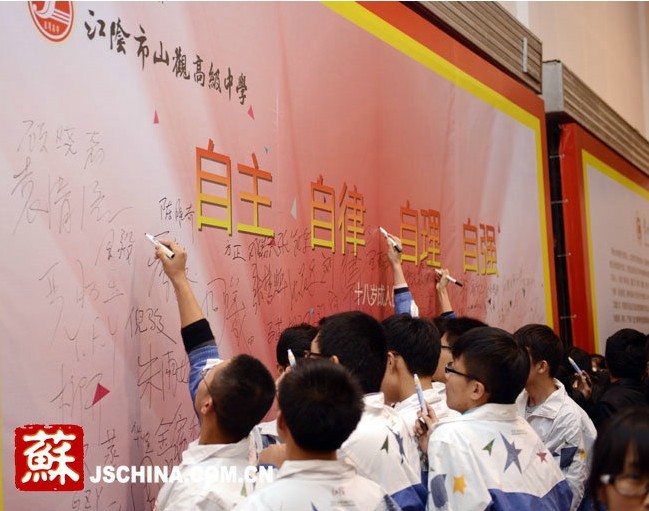 中国江苏网11月24日讯(通讯员包海霞郁涛记者赵家玮) 11月22日下午,江阴市山观高级中学全体高三学生来到常州大学成人仪式教育基地,举行“成长·感恩·责任”十八岁成人宣誓仪式。仪式中,即将成人的学生们面对国旗,庄严宣誓;在成人墙上,庄重签名。