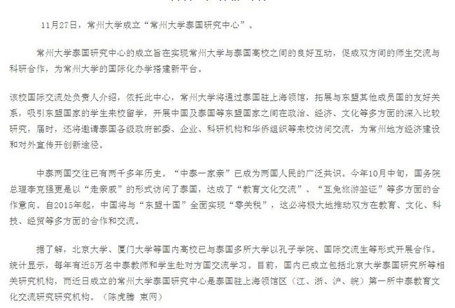 11月27日,常州大学成立“常州大学泰国研究中心”。