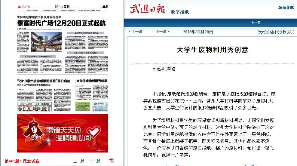 为了增强材料系学生的环保意识和新材料观念,让同学们发现和利用生活中随处可见的废弃材料,常州大学材料学院举办了这次比赛。同学们用废纸箱做的收纳盒不但在外面蒙上了一层包装纸,而且每个抽屉上都装了把手,既美观又实用。其他作品也毫不逊色,一位同学以口香糖和废旧报纸、铝片为原材料,制作出一架飞机模型,赢得一片掌声。