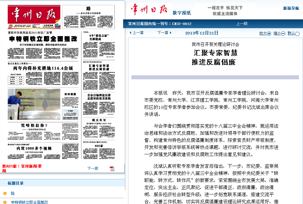 与会学者们围绕贯彻落实党的十八届三中全会精神,就运用法治思维和法治方式反腐败、加强和改进对领导干部行使权力的监督、构建常州特色的反腐倡廉制度体系、探索官员财产申报制度、开发和完善信访举报系统等热点课题,进行研讨交流,并对我市进一步加强党风廉政建设和反腐败工作提出意见和建议。