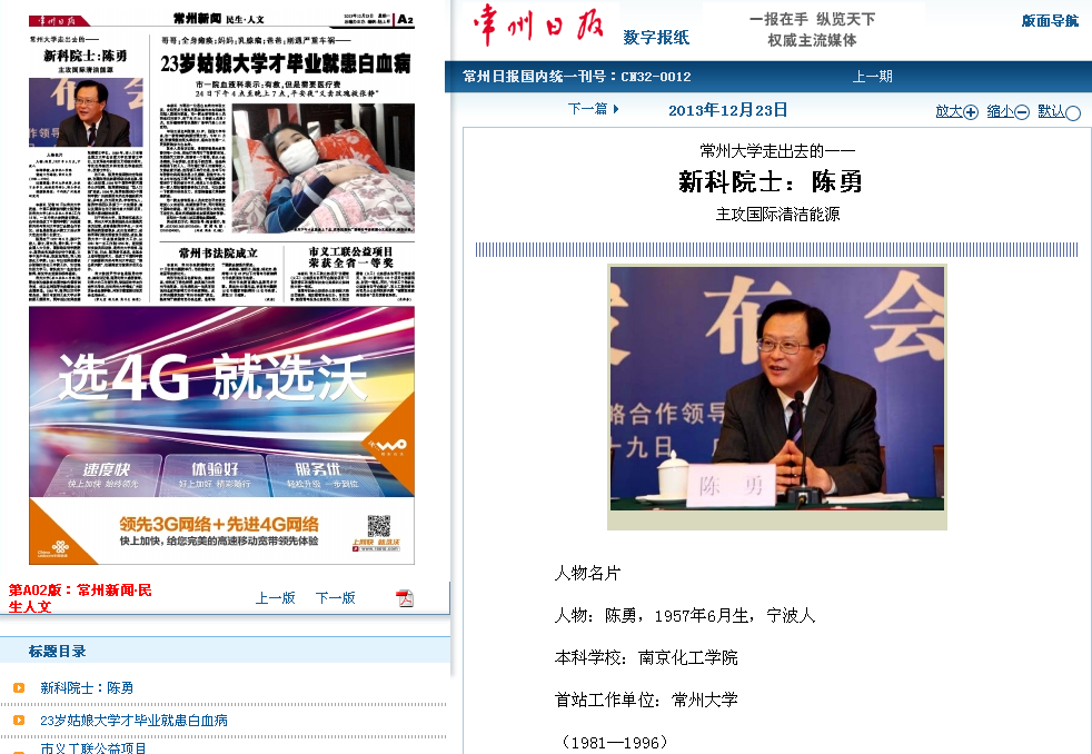 本报讯 记者20日从常州大学获悉,中国工程院新科院士陈勇曾在常州大学(原江苏化工学院)工作15年,一直与常大保持密切联系,近年来促成了中国科学院广州能源研究所与常州大学签订全面合作协议。他也是继张全兴院士之后从常大走出的第二位院士。