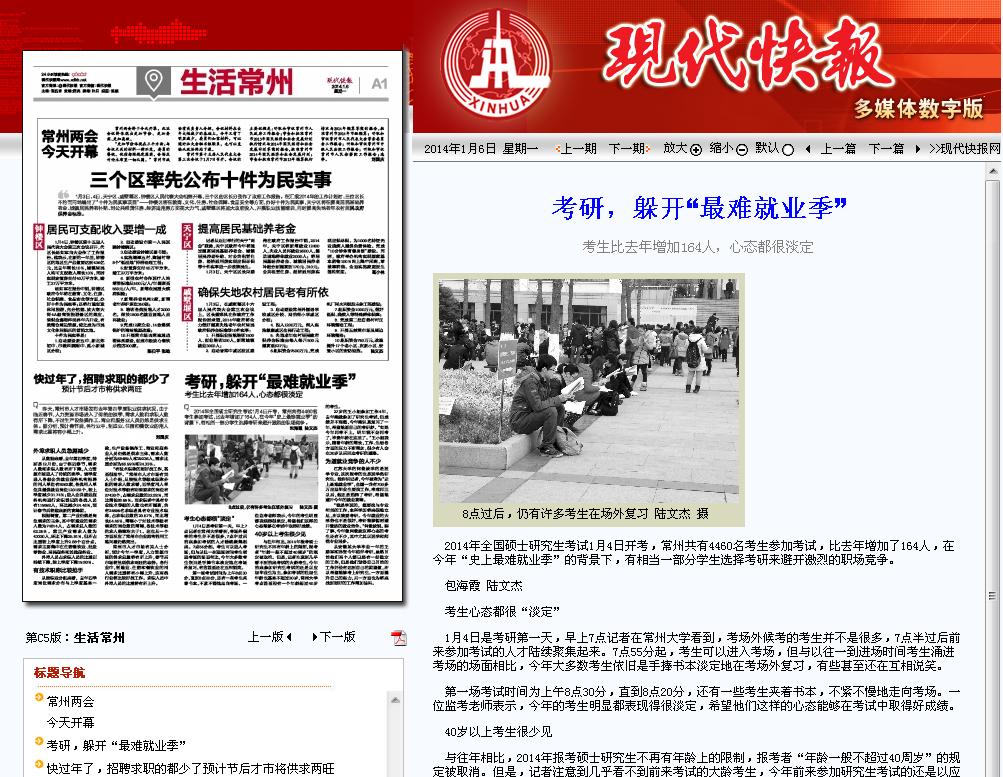 2014年全国硕士研究生考试1月4日开考,常州共有4460名考生参加考试,比去年增加了164人,在今年“史上最难就业季”的背景下,有相当一部分学生选择考研来避开激烈的职场竞争。(包海霞 陆文杰)