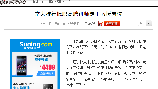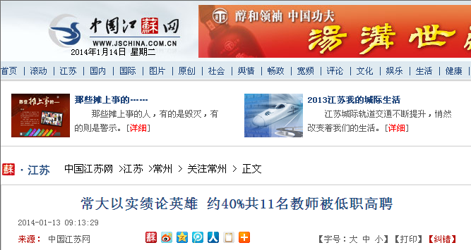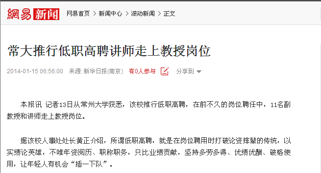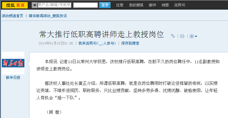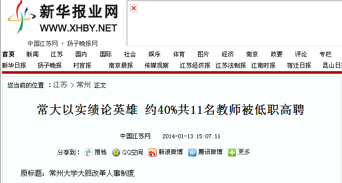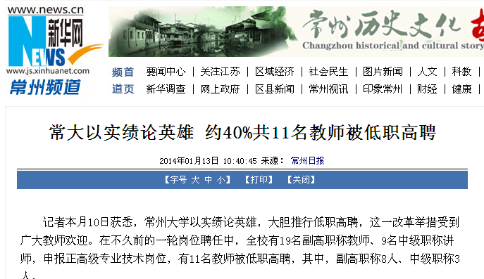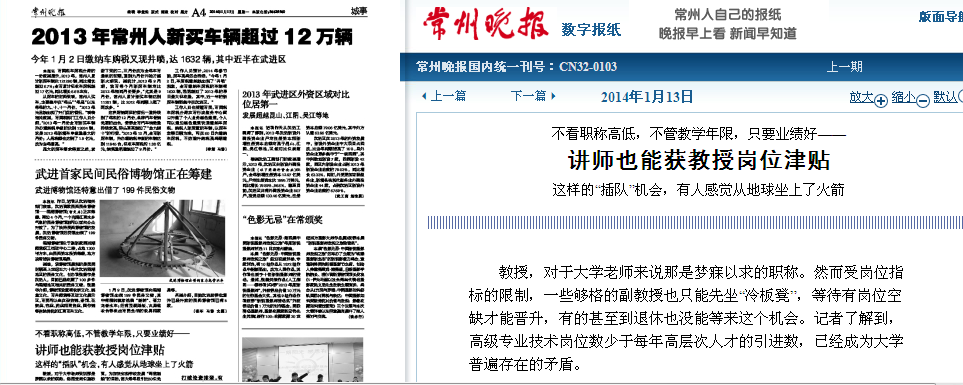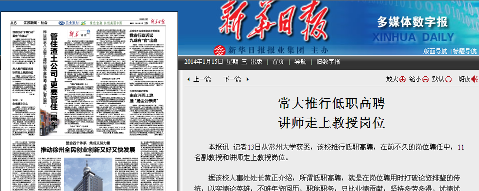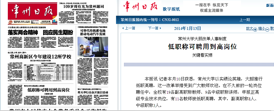 1月15日,新华日报A6版“江苏新闻·社会”以“常大推行低职高聘 讲师走上教授岗位”为题报道我校大胆改革人事制度,推行低职高聘新举措。光明网“新闻中心”以“讲师也能获教授岗位津贴”为题报道我校低职高聘举措。近日,《常州日报》、《常州晚报》、新华网、新华报业网、中国江苏网、中国常州网、中吴网、网易、新浪、搜狐等媒体也纷纷在重要位置大篇幅报道我校这一人事制度改革新举措,在社会各界引起强烈反响。