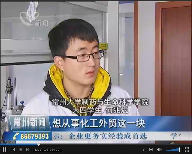 常州大学制药与生命科学学院大四学生何兆斌:“想从事化工外贸这一块,赶快做完(毕业设计),趁毕业之前有时间去公司,实习一段时间。”