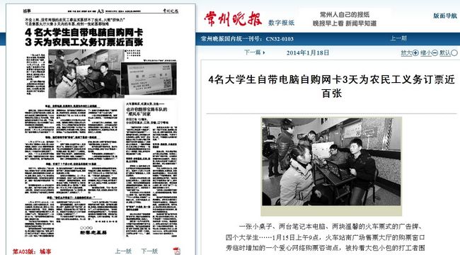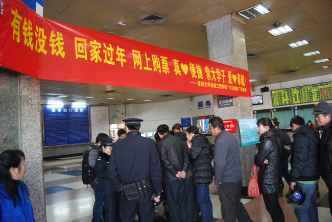 春运之前,在常州大学机械工程学院读大三的蒋月波在网上看到,很多外地农民工很难买到车票,“12306官网站可以买到20天内的票,可有些年纪大的农民工不会上网。”于是,蒋月波和其他3名小伙伴想到了去火车站帮农民工网络查票。