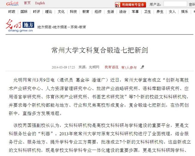 光明网常州3月9日电(通讯员 葛金华 潘道广)近日,常州大学宣布成立“创新与高技术产业研究中心、人力资源管理研究中心、旅游产业战略研究所、语料库翻译研究所、应用语言学研究所、体育休闲产业研究所、书画艺术研究院”等7个新的校级文科科研机构,并要求每个新机构都能与地方、行业和兄弟高校形成复合,复合锻造七把新剑,在协同创新中,直指多方发展难题。