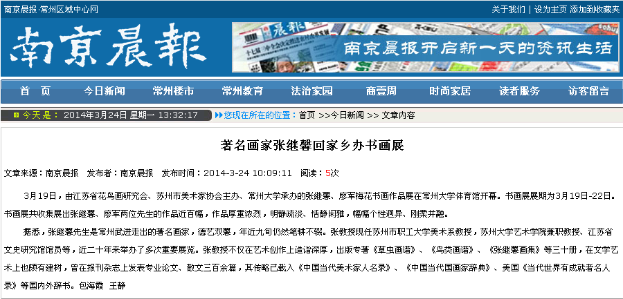 据悉,张继馨先生是常州武进走出的著名画家,德艺双馨,年近九旬仍然笔耕不辍。张教授现任苏州市职工大学美术系教授,苏州大学艺术学院兼职教授、江苏省文史研究馆馆员等,近二十年来举办了多次重要展览。张教授不仅在艺术创作上造诣深厚,出版专著《草虫画谱》、《鸟类画谱》、《张继馨画集》等三十册,在文学艺术上也颇有建树,曾在报刊杂志上发表专业论文、散文三百余篇,其传略已载入《中国当代美术家人名录》、《中国当代国画家辞典》、美国《当代世界有成就者名人录》等国内外辞书。包海霞 王静