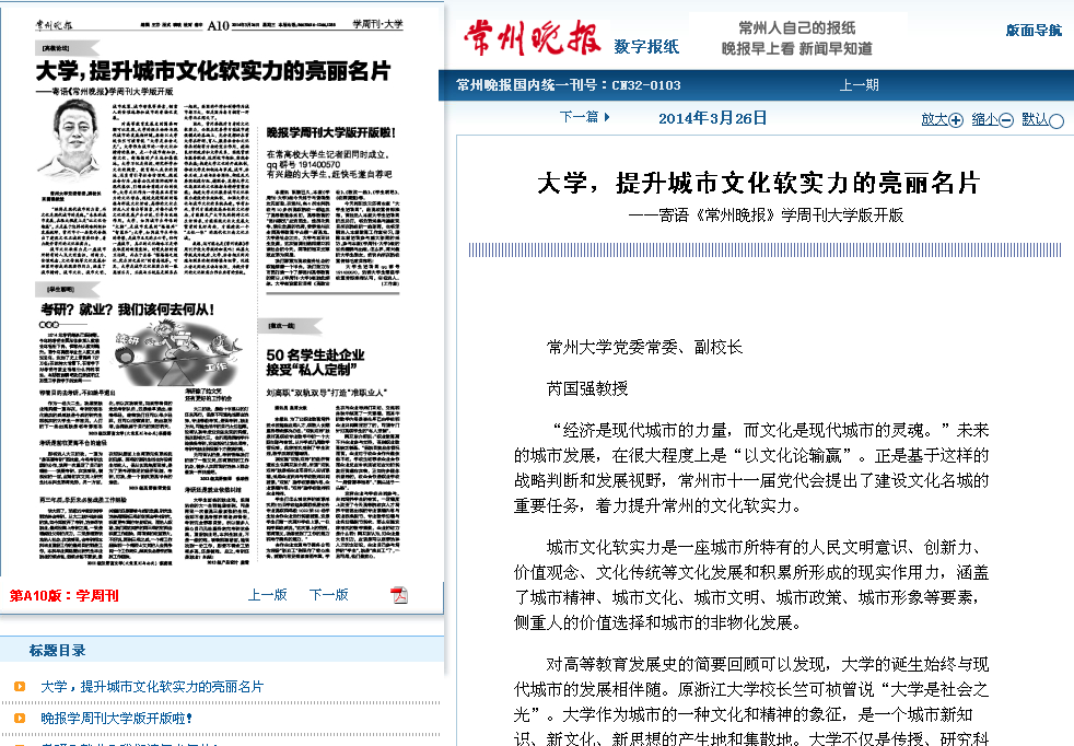我想,这可能也是《常州晚报》学周刊开设大学版的初衷吧!祝愿大学版成为政府、大学、社会相互间沟通与联系的新的桥梁与纽带,促进三者之间的互动与协同,为提升常州的文化软实力作出应有的贡献。