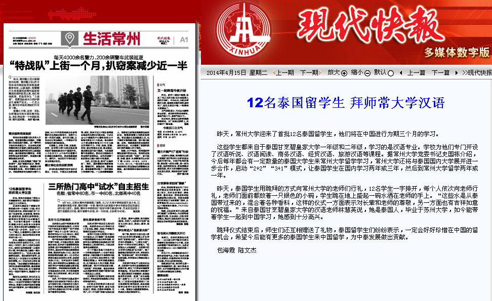 这些学生都来自于泰国甘烹碧皇家大学一年级和二年级,学习的是汉语专业。学校为他们专门开设了汉语听说、汉语阅读、商务汉语、经贸汉语、旅游汉语等课程。据常州大学党委书记史国栋介绍,今后每年都会有一定数量的泰国大学生来常州大学留学学习,常州大学还将与泰国国内大学展开进一步合作,启动“2+2”“3+1”模式,让泰国学生在国内学习两年或三年,然后到常州大学留学两年或一年。