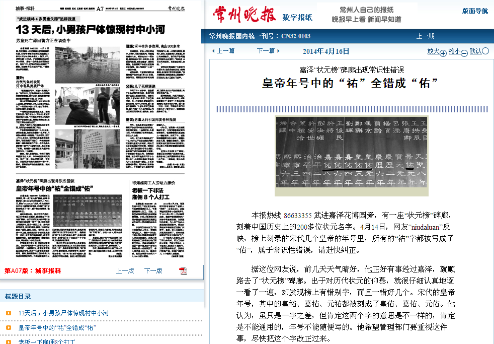 本报热线 86633355 武进嘉泽花博园旁,有一座“状元榜”碑廊,刻着中国历史上的200多位状元名字。4月14日,网友“niudaluan”反映,榜上刻录的宋代几个皇帝的年号里,所有的“祐”字都被写成了“佑”,属于常识性错误,请赶快纠正。