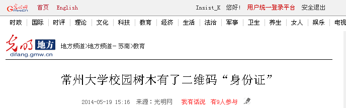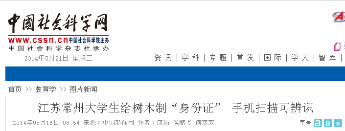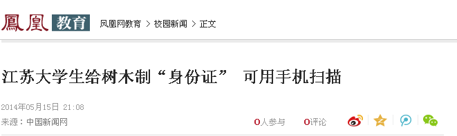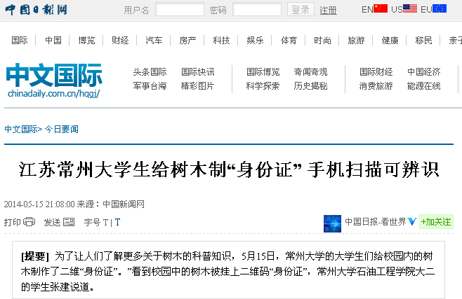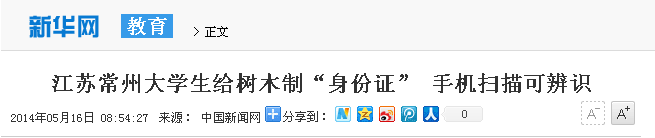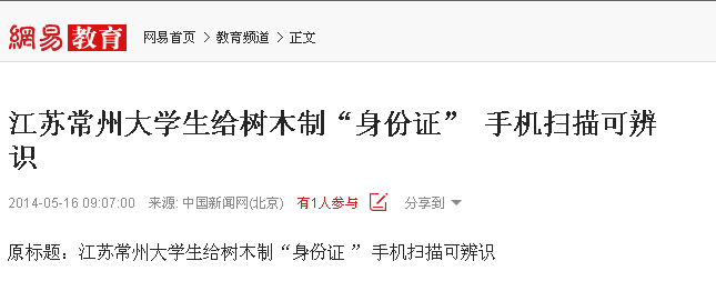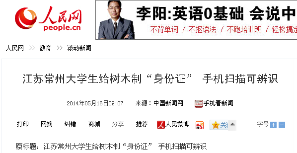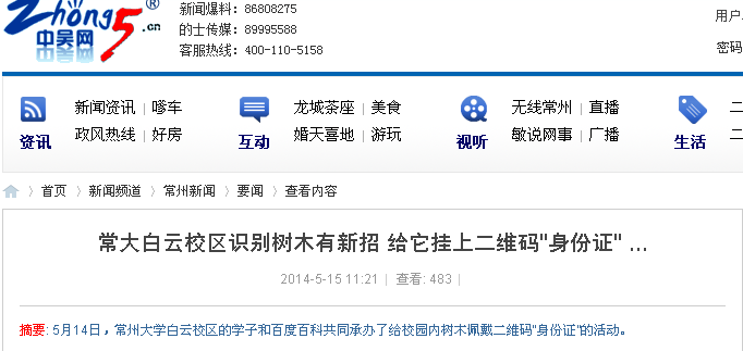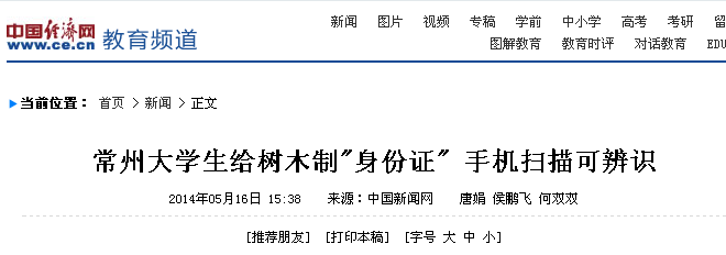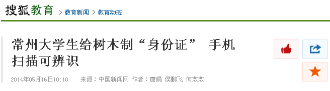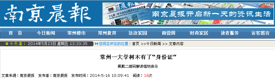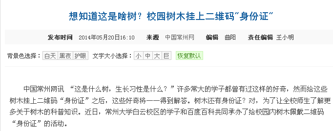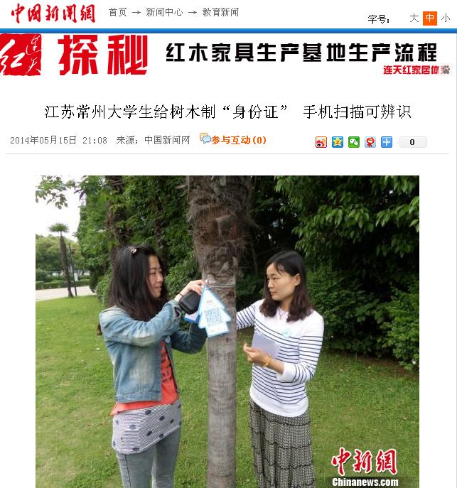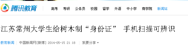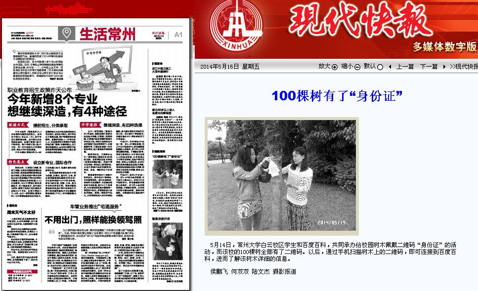 5月14日,我校白云校区的学子和百度百科共同承办了为校园内树木佩戴二维码“身份证”的活动。此活动得到媒体纷纷关注。光明网、中国新闻网、人民网、新华网、凤凰网、中国日报网、中国经济网、新浪、搜狐、腾讯、现代快报、南京晨报、中国江苏网、中国常州网、中吴网等国家、省、市级媒体进行了集中报道。