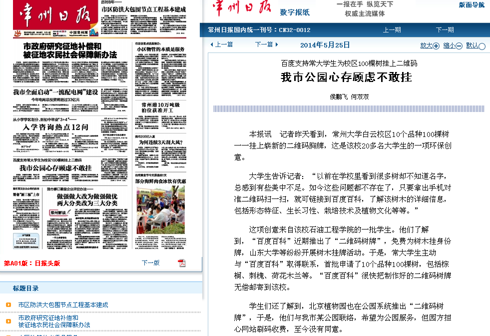 这项创意来自该校石油工程学院的一批学生。他们了解到,“百度百科”近期推出了“二维码树牌”,免费为树木挂身份牌,山东大学等纷纷开展树木挂牌活动。于是,常大学生主动与“百度百科”取得联系,首批申请了10个品种100棵树,包括棕榈、刺槐、荷花木兰等。“百度百科”很快把制作好的二维码树牌无偿邮寄到该校。