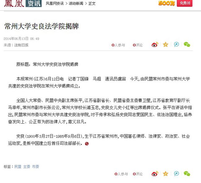 本报常州(江苏)6月12日电 记者丁国锋 马超 通讯员虞宙 今天,由民盟常州市委与常州大学共建的史良法学院在常州大学揭牌成立。