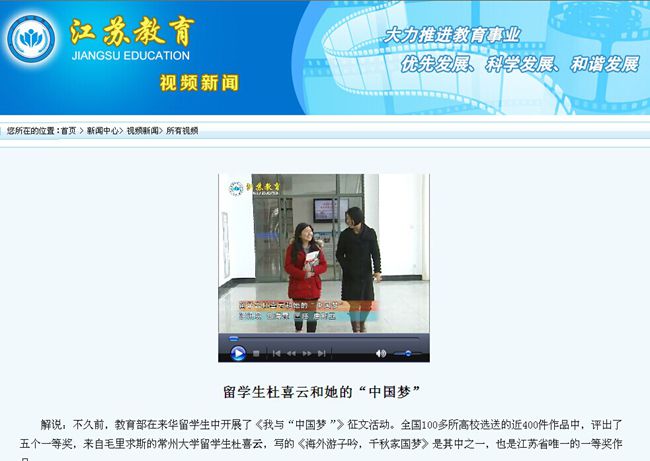 解说:不久前,教育部在来华留学生中开展了《我与“中国梦”》征文活动。全国100多所高校选送的近400件作品中,评出了五个一等奖,来自毛里求斯的常州大学留学生杜喜云,写的《海外游子吟,千秋家国梦》是其中之一,也是江苏省唯一的一等奖作品。