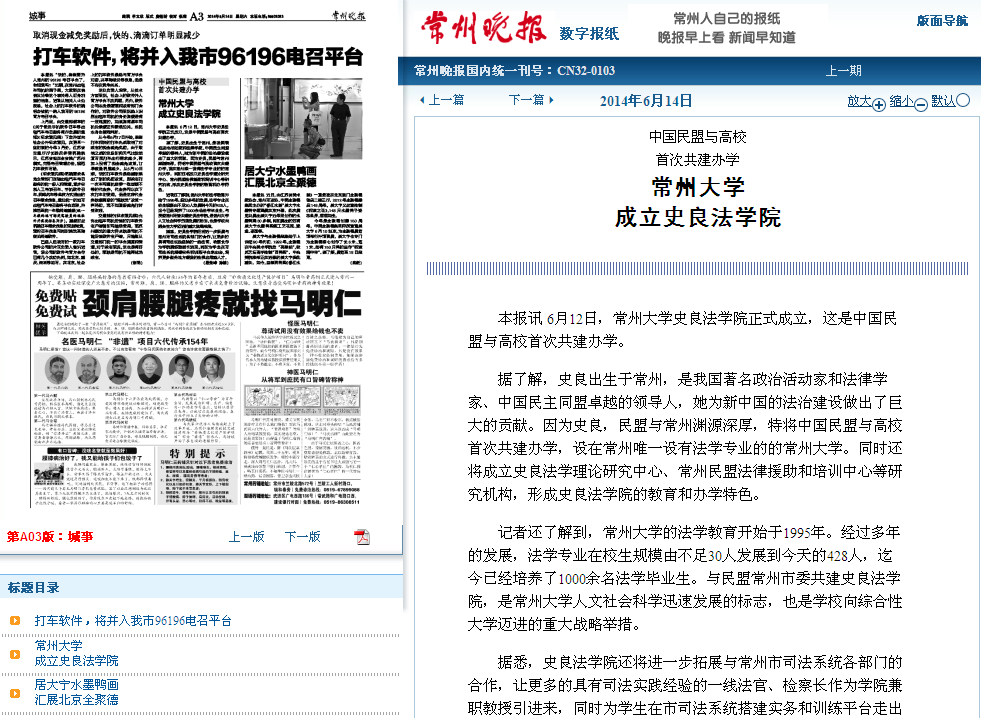 记者还了解到,常州大学的法学教育开始于1995年。经过多年的发展,法学专业在校生规模由不足30人发展到今天的428人,迄今已经培养了1000余名法学毕业生。与民盟常州市委共建史良法学院,是常州大学人文社会科学迅速发展的标志,也是学校向综合性大学迈进的重大战略举措。