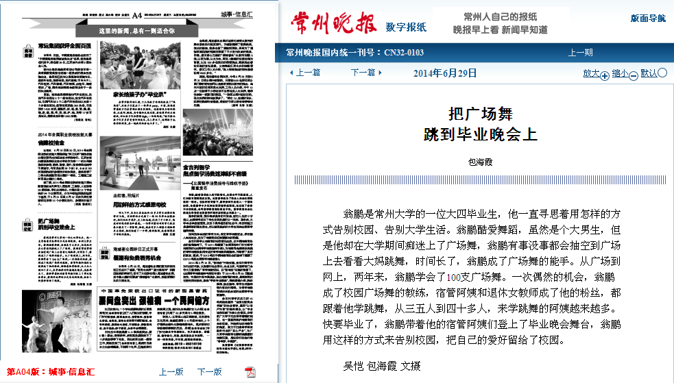 翁鹏是常州大学的一位大四毕业生,他一直寻思着用怎样的方式告别校园、告别大学生活。翁鹏酷爱舞蹈,虽然是个大男生,但是他却在大学期间痴迷上了广场舞,翁鹏有事没事都会抽空到广场上去看看大妈跳舞,时间长了,翁鹏成了广场舞的能手。从广场到网上,两年来,翁鹏学会了100支广场舞。一次偶然的机会,翁鹏成了校园广场舞的教练,宿管阿姨和退休女教师成了他的粉丝,都跟着他学跳舞,从三五人到四十多人,来学跳舞的阿姨越来越多。快要毕业了,翁鹏带着他的宿管阿姨们登上了毕业晚会舞台,翁鹏用这样的方式来告别校园,把自己的爱好留给了校园。