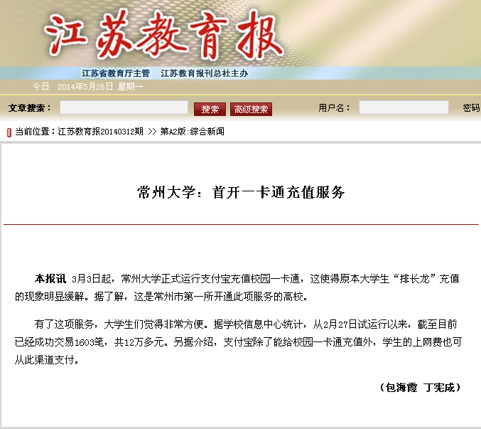 常州大学:首开一卡通充值服务