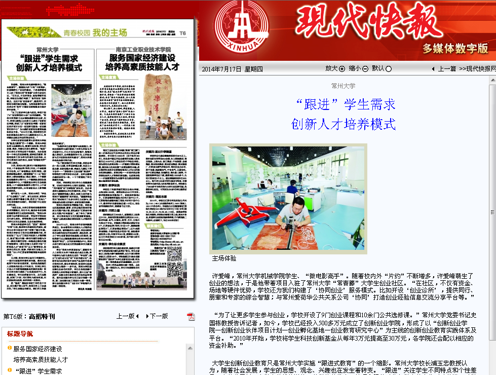 许爱峰,常州大学机械学院学生、“微电影高手”。随着校内外“片约”不断增多,许爱峰萌生了创业的想法,于是他带着项目入驻了常州大学“常青藤”大学生创业社区。“在社区,不仅有资金、场地等硬件优势,学校还为我们构建了‘协同创业’服务模式。比如开设‘创业诊所’,提供同行、朋辈和专家的综合智慧;与常州爱荷华公共关系公司‘协同’打造创业经验信息交流分享平台等。”