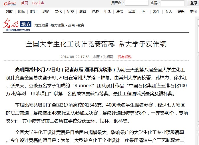 8月20日上午, 2014“恒逸—三井化学杯”第八届全国大学生化工设计竞赛全国总决赛在常州大学圆满落下帷幕。浙江大学、常州大学、天津大学、南京工业大学、华东理工大学、四川大学等8所学校的团队设计作品获特等奖;特等奖前三名所在学校浙江大学、常州大学、天津大学分获金杯、银杯和铜杯奖;大连理工大学、中国石油大学(华东)、西北大学等40所学校的团队设计作品获一等奖。