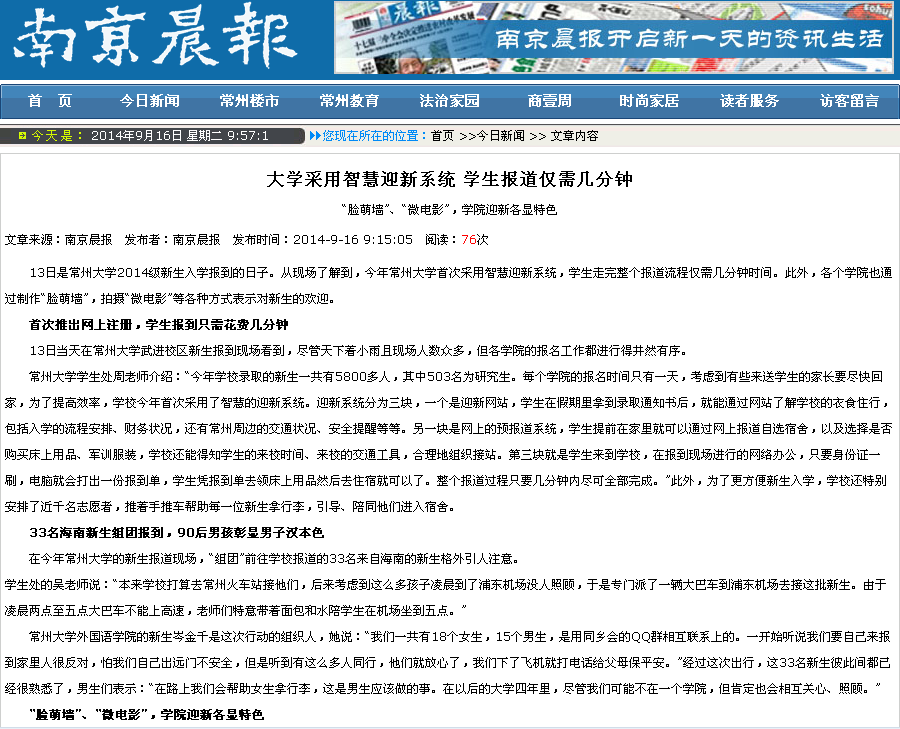 常州大学学生处周老师介绍:“今年学校录取的新生一共有5800多人,其中503名为研究生。每个学院的报名时间只有一天,考虑到有些来送学生的家长要尽快回家,为了提高效率,学校今年首次采用了智慧的迎新系统。迎新系统分为三块,一个是迎新网站,学生在假期里拿到录取通知书后,就能通过网站了解学校的衣食住行,包括入学的流程安排、财务状况,还有常州周边的交通状况、安全提醒等等。另一块是网上的预报道系统,学生提前在家里就可以通过网上报道自选宿舍,以及选择是否购买床上用品、军训服装,学校还能得知学生的来校时间、来校的交通工具,合理地组织接站。第三块就是学生来到学校,在报到现场进行的网络办公,只要身份证一刷,电脑就会打出一份报到单,学生凭报到单去领床上用品然后去住宿就可以了。整个报道过程只要几分钟内尽可全部完成。”此外,为了更方便新生入学,学校还特别安排了近千名志愿者,推着手推车帮助每一位新生拿行李,引导、陪同他们进入宿舍。