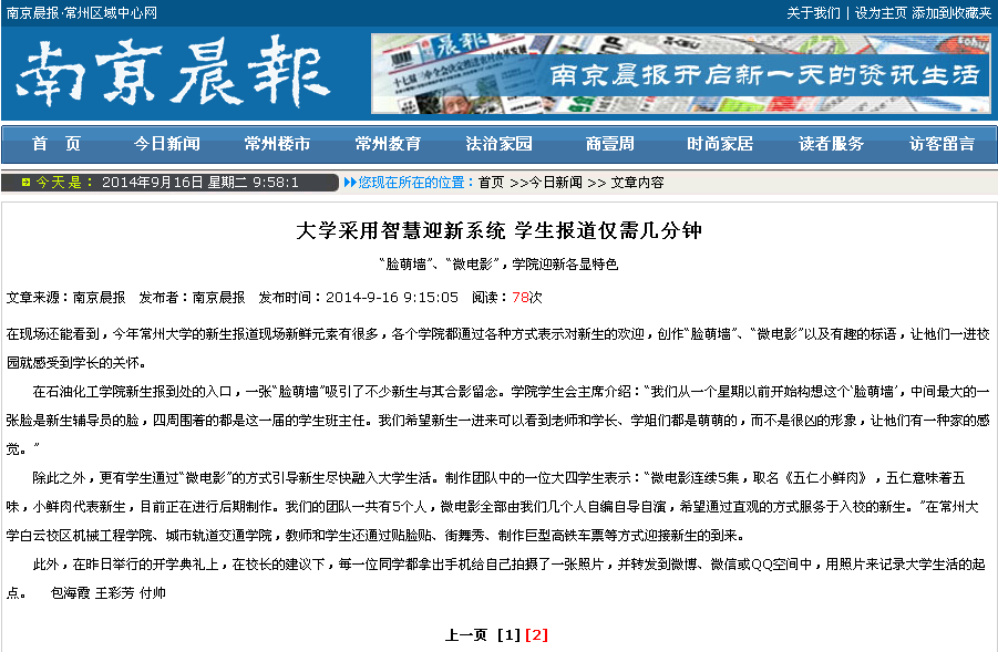 13日是常州大学2014级新生入学报到的日子。从现场了解到,今年常州大学首次采用智慧迎新系统,学生走完整个报道流程仅需几分钟时间。此外,各个学院也通过制作“脸萌墙”,拍摄“微电影”等各种方式表示对新生的欢迎。
