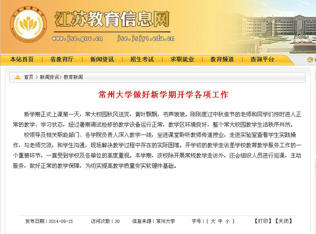 江苏教育信息网:常州大学做好新学期开学各项工作