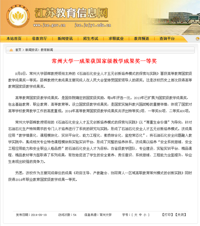 江苏教育信息网:常州大学一成果获国家级教学成果奖一等奖