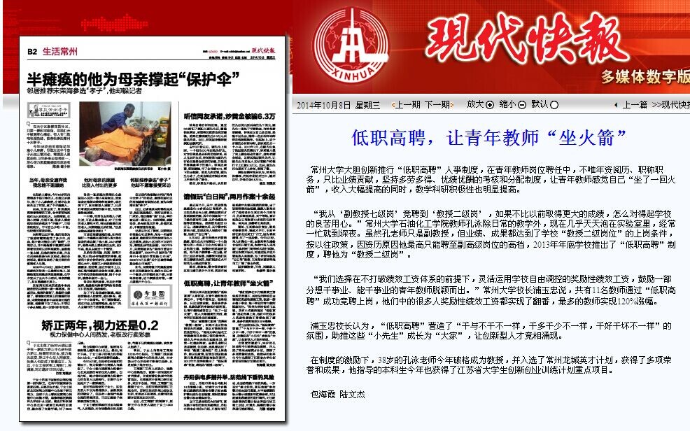 在制度的激励下,38岁的孔泳老师今年破格成为教授,并入选了常州龙城英才计划,获得了多项荣誉和成果,他指导的本科生今年也获得了江苏省大学生创新创业训练计划重点项目。包海霞 陆文杰