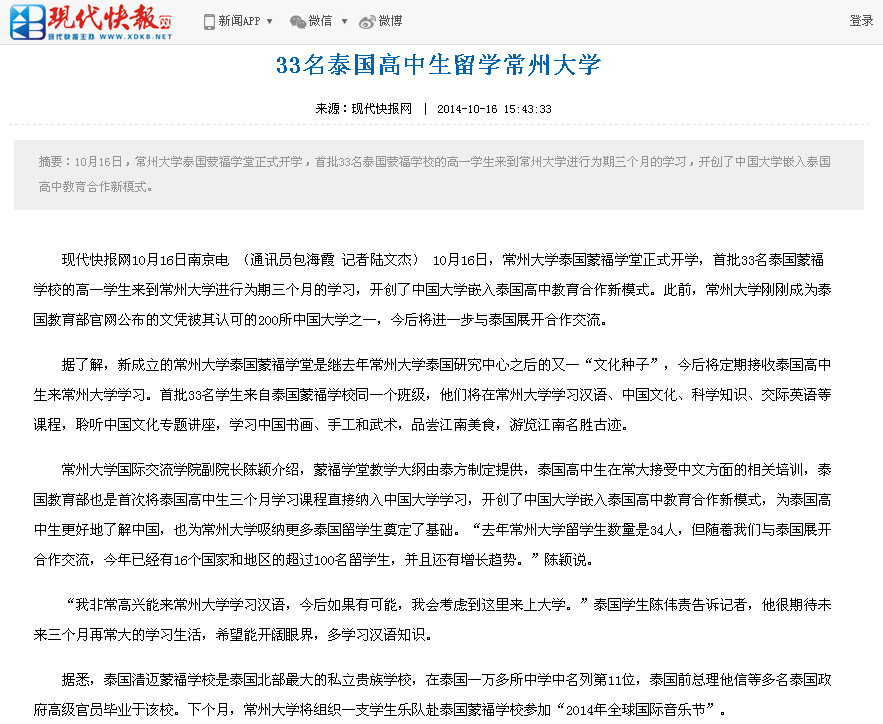 现代快报网10月16日南京电 (通讯员包海霞 记者陆文杰) 10月16日,常州大学泰国蒙福学堂正式开学,首批33名泰国蒙福学校的高一学生来到常州大学进行为期三个月的学习,开创了中国大学嵌入泰国高中教育合作新模式。此前,常州大学刚刚成为泰国教育部官网公布的文凭被其认可的200所中国大学之一,今后将进一步与泰国展开合作交流。