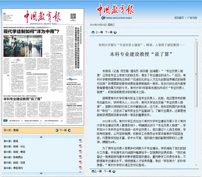 本报讯(记者 缪志聪 通讯员 陈宇豪 包海霞)“‘专业负责人制度’让我在专业上有很大的自主权,激发了专业建设的活力。”近日,常州大学教授邵辉领衔主持的“石油石化安全人才五元创新培养模式的探索与实践”获得国家级教学成果奖高等教育类一等奖。在去行政化成为高等教育管理改革方向的今天,常州大学3年前率先提出并试行“专业负责人制度”,积极探索教授治学的破冰之路。