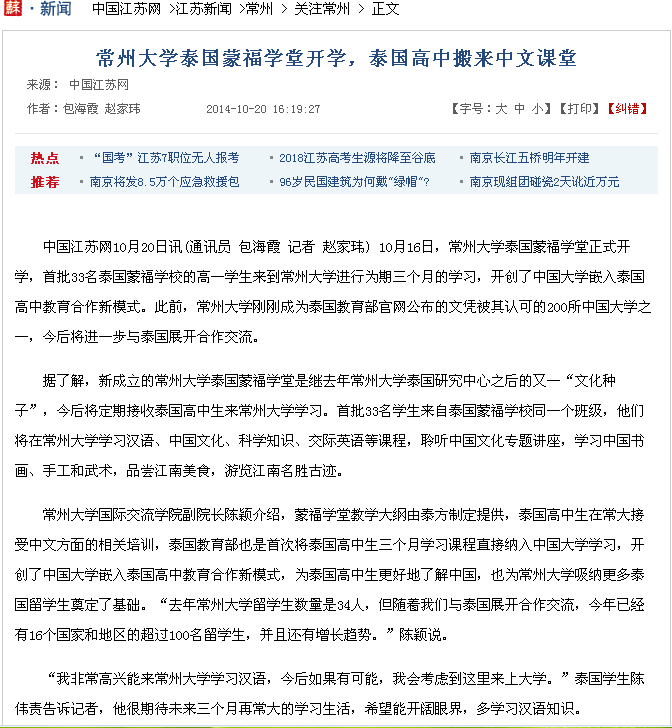 中国江苏网10月20日讯(通讯员 包海霞 记者 赵家玮) 10月16日,常州大学泰国蒙福学堂正式开学,首批33名泰国蒙福学校的高一学生来到常州大学进行为期三个月的学习,开创了中国大学嵌入泰国高中教育合作新模式。此前,常州大学刚刚成为泰国教育部官网公布的文凭被其认可的200所中国大学之一,今后将进一步与泰国展开合作交流。