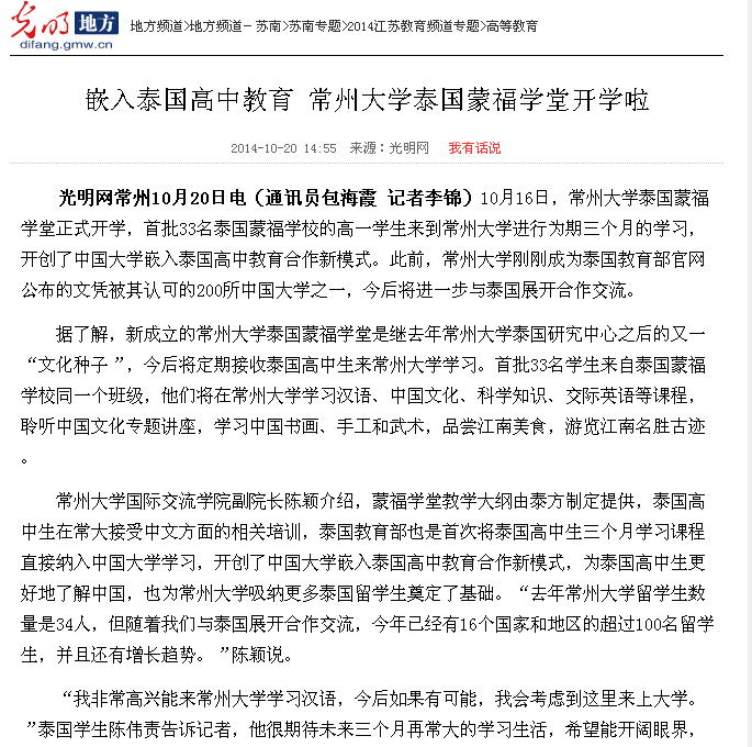 光明网常州10月20日电(通讯员包海霞 记者李锦)10月16日,常州大学泰国蒙福学堂正式开学,首批33名泰国蒙福学校的高一学生来到常州大学进行为期三个月的学习,开创了中国大学嵌入泰国高中教育合作新模式。此前,常州大学刚刚成为泰国教育部官网公布的文凭被其认可的200所中国大学之一,今后将进一步与泰国展开合作交流。