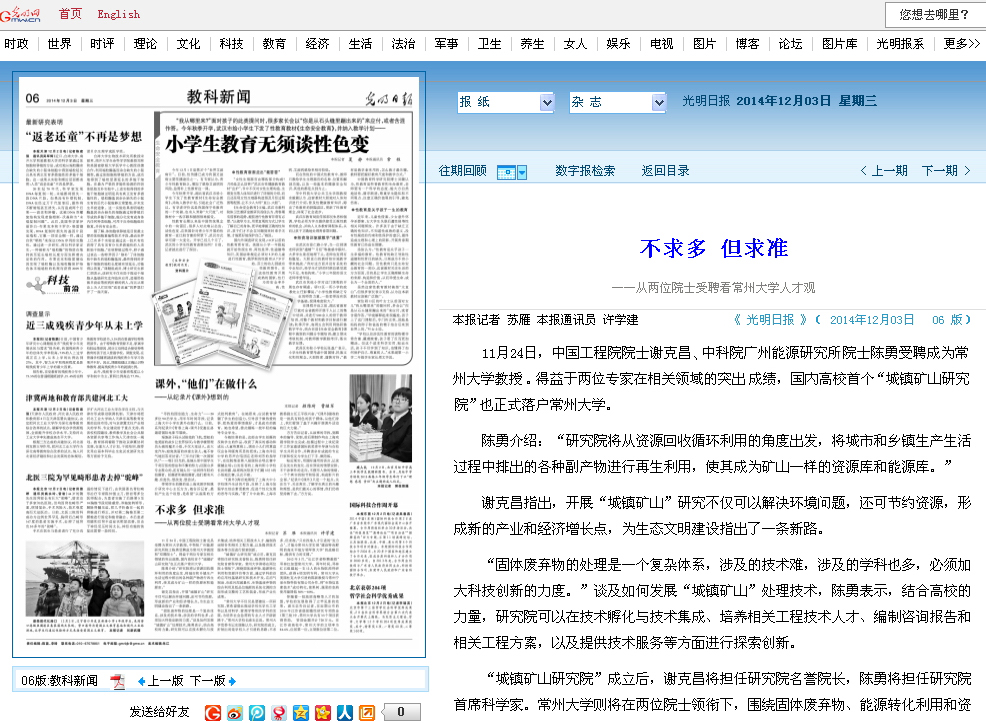 11月24日,中国工程院院士谢克昌、中科院广州能源研究所院士陈勇受聘成为常州大学教授。得益于两位专家在相关领域的突出成绩,国内高校首个“城镇矿山研究院”也正式落户常州大学。