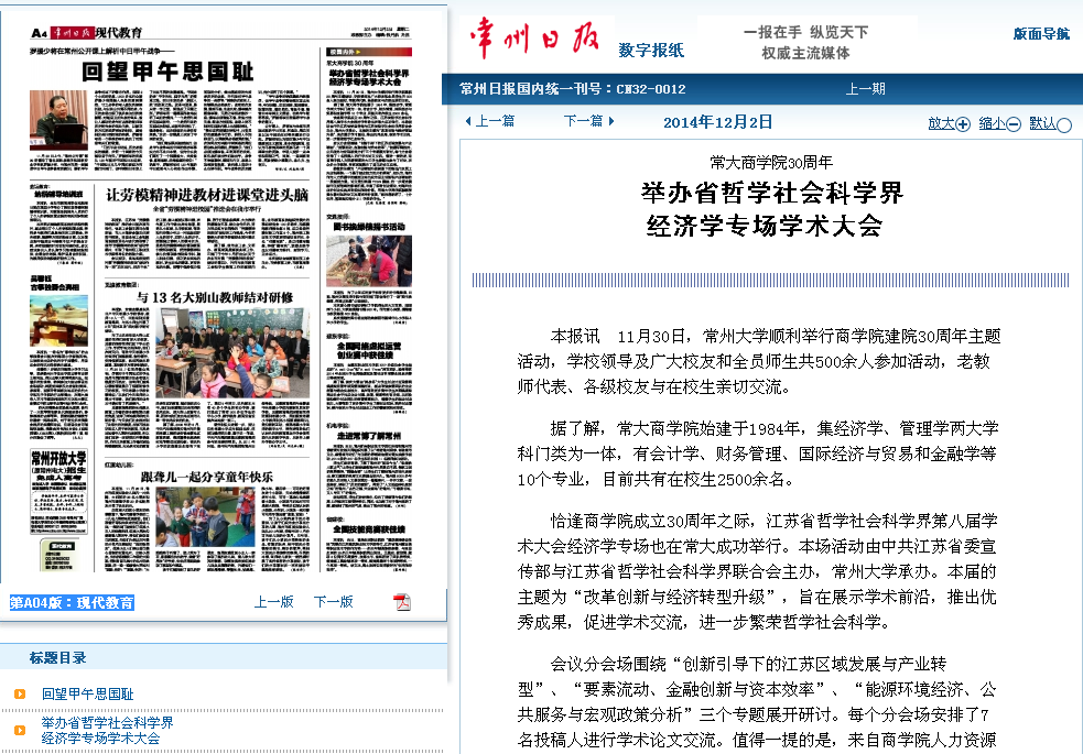 恰逢商学院成立30周年之际,江苏省哲学社会科学界第八届学术大会经济学专场也在常大成功举行。本场活动由中共江苏省委宣传部与江苏省哲学社会科学界联合会主办,常州大学承办。本届的主题为“改革创新与经济转型升级”,旨在展示学术前沿,推出优秀成果,促进学术交流,进一步繁荣哲学社会科学。