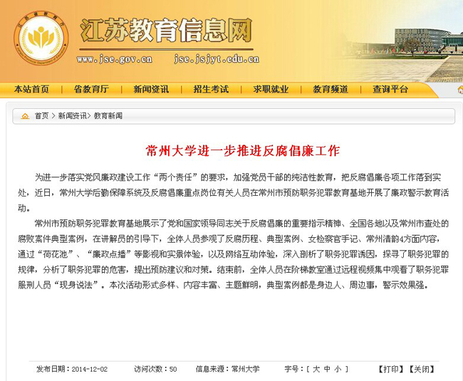 江苏教育信息网:常州大学进一步推进反腐倡廉工作