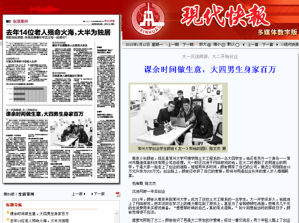 南京小伙颜岩,现在是常州大学环境学院土木工程系的一名大四学生,他还有另外一个身份——常州市履道信息科技有限公司总经理。大一时还沉迷于网络游戏的他,在大二时遇到了志同道合的同学,于是大家一起走上了创业的道路,短短两年多时间,颜岩拥有了自己的公司,最近公司刚刚由10万元升资为200万元。创业路上,颜岩还收获了自己的爱情,即将与同是创业伙伴的爱人步入婚姻殿堂。(包海霞 陆文杰)