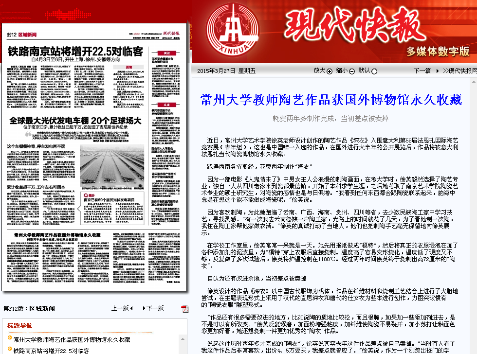 "我也没想到会入选,因为国外机构挑选作品非常严格,不仅要看视觉效果,还要附创作说明,陶瓷材质运用和陶瓷工艺都要有所创新和突破。"徐英说,虽然她依旧舍不得作品,但是能够被国外博物馆看中,也代表了一种荣誉,她还是决定将作品寄出去。展览完毕后,徐英的"陶衣"作品还将被意大利法恩扎当代陶瓷博物馆永久收藏。(包海霞 陆文杰)
