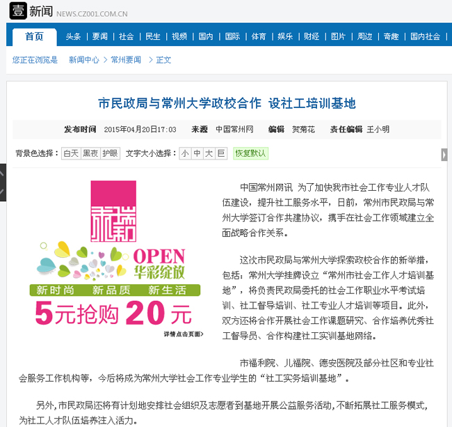 这次市民政局与常州大学探索政校合作的新举措,包括:常州大学挂牌设立“常州市社会工作人才培训基地”,将负责民政局委托的社会工作职业水平考试培训、社工督导培训、社工专业人才培训等项目。此外,双方还将合作开展社会工作课题研究、合作培养优秀社工督导员、合作构建社工实训基地网络。