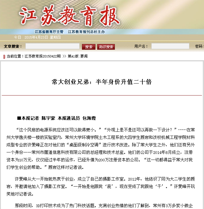 “这个风扇的电源系统应该还可以做得更小。”“外观上是不是还可以再做一下设计?”……在常州大学逸夫楼一楼的实验室内,常州大学环境学院土木工程系的大四学生颜岩和该校机械工程学院材料成型专业的许爱峰正在对他们的“桌面级制冷空调”进行技术改进。除了常大学生之外,他们还有另外一个身份——常州市履道信息科技有限公司的总经理和技术总监。他们的公司于2014年8月成立,注册资本为10万元,仅仅经过半年的运作,已经升值为200万注册资本的公司。“这一切都得益于常大对我们学生创业的帮助。”颜岩这样对记者说。